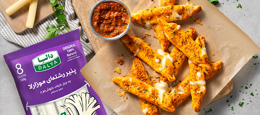 2. یک عدد پنیر رشته ای را در مرکز هر خمیر قرار داده و کناره ها و انتهای آن را روی پنیر قرار دهید و روی هم فشار دهید تا خمیر پنیرا را احاطه کند.