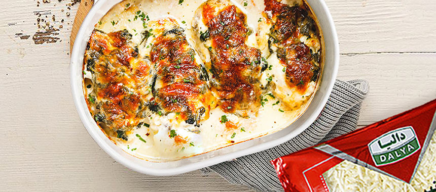 - سینه های مرغ را در یک ظرف پخت بچینید. پنیر خامه ای نرم شده را روی سینه مرغ بمالید و اسفناج را روی پنیر خامه ای قرار دهید و در نهایت، موزارلا را روی آن بپاشید.