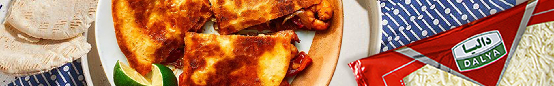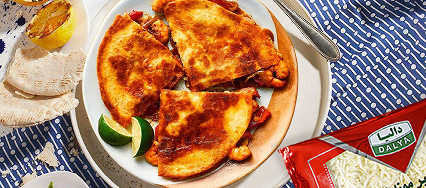 - تورتیلا را به تابه اضافه کنید و نیمی از پنیر را روی تورتیلا بپاشید، سپس مخلوط میگو را روی آن بریزید و پنیر باقی مانده را به آن اضافه کنید.